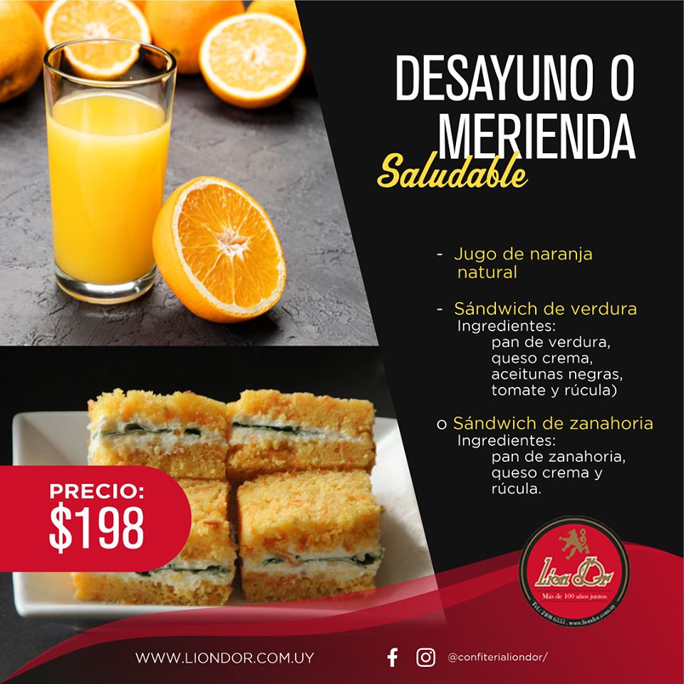 – Sándwich de verdura (pan de verdura, queso crema, aceitunas negras, tomate y rúcula) o sándwich de zanahoria (pan de zanahoria, rúcula y queso crema)