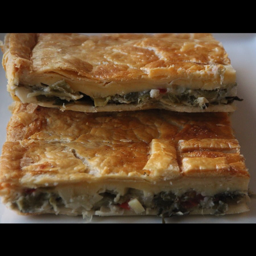 Torta masa hojaldre de puerro, muzzarella y palmitos
